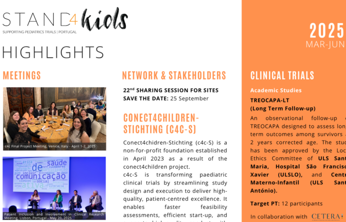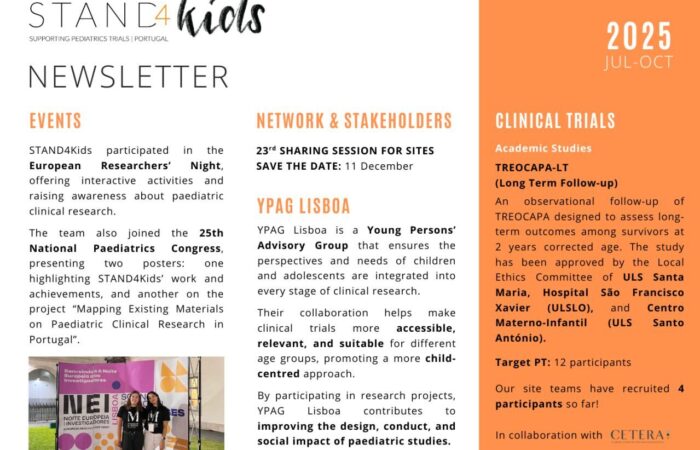 A equipa STAND4Kids participou no 25.º Congresso Nacional de Pediatria, que decorreu de 29 a 31 de outubro, no Porto. Durante o congresso, apresentámos dois posters com discussão, um dedicado ao trabalho da Rede STAND4Kids e outro ao projeto “Mapeamento de Materiais sobre Investigação Clínica Pediátrica em Portugal”. O nosso agradecimento à Sociedade Portuguesa de...